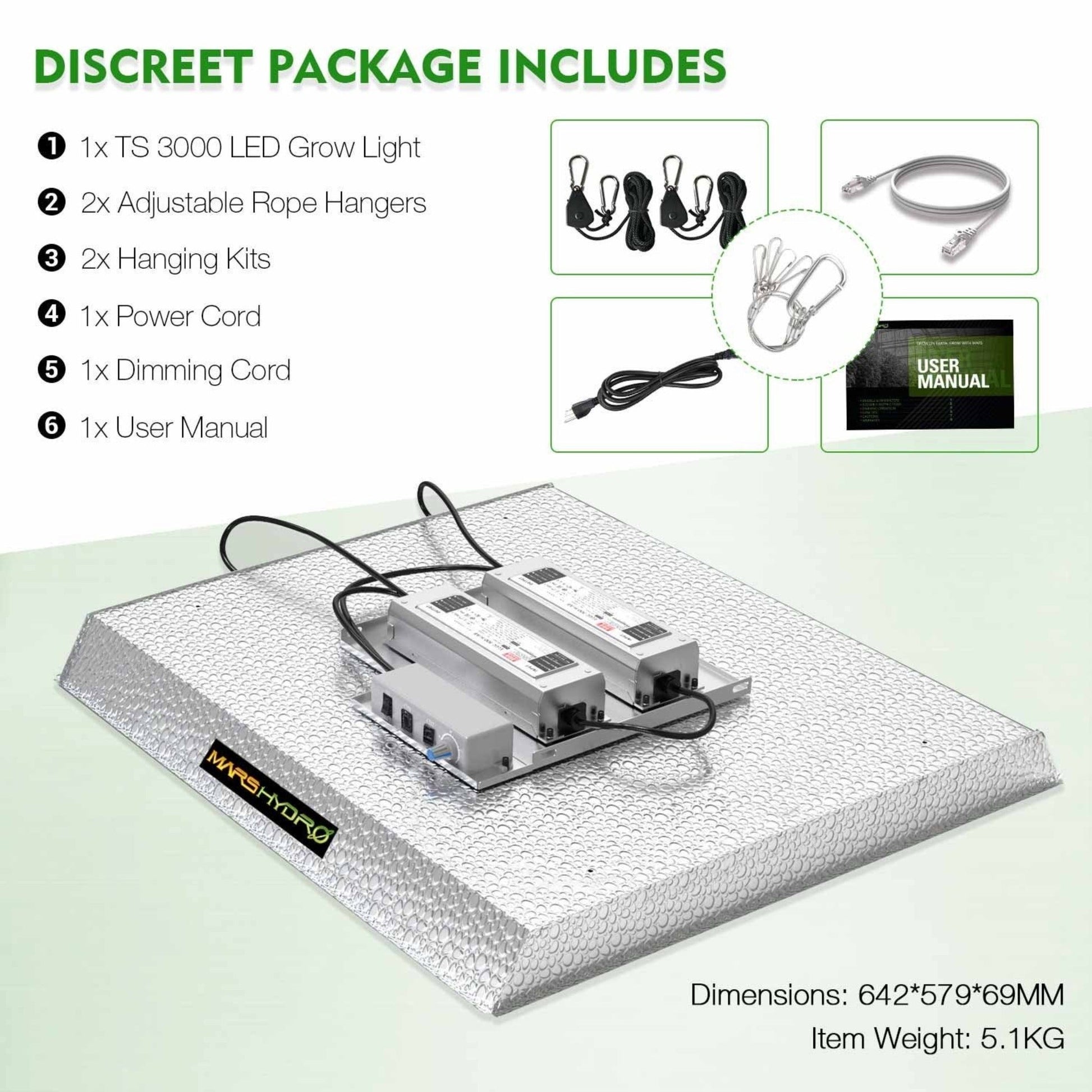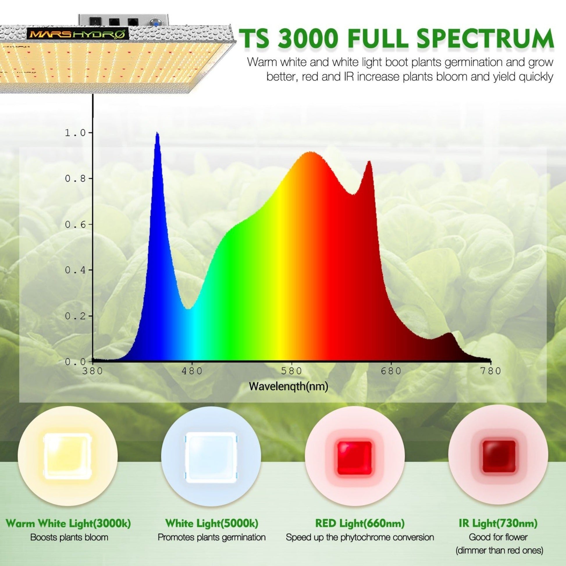 The Mars Hydro 450W LED Grow Light TS 3000 is equipped with a patented reflective hood. This unique feature ensures that light spread is maximized in all directions, providing optimal coverage for your plants. By attracting and reflecting light, the reflective hood also enhances the plants' ability to absorb light, promoting healthy growth and maximizing yields.